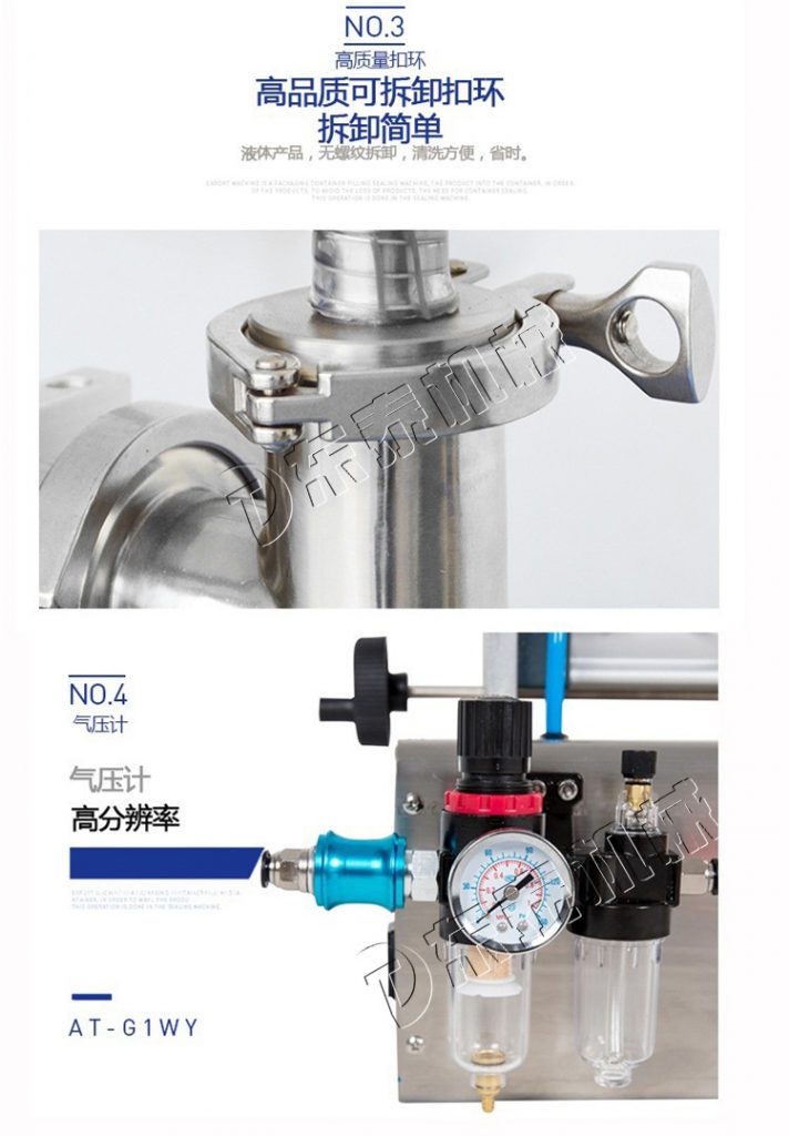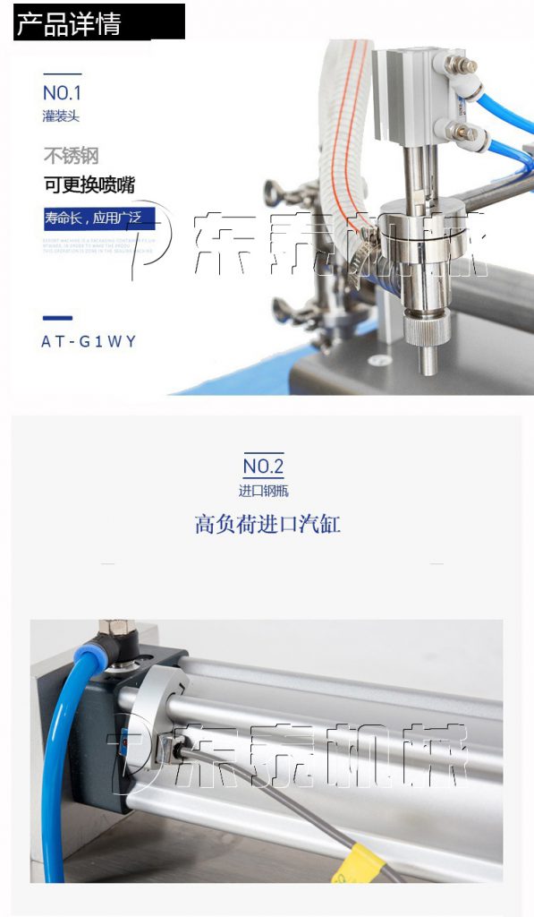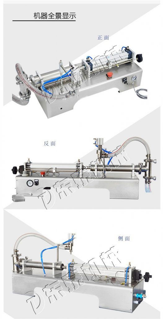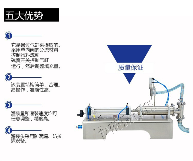 小型液體定量灌裝機(jī),通過氣缸帶動(dòng)一個(gè)活塞來抽取和打出物料,用單項(xiàng)閥控制物料流向,小型液體定量灌裝機(jī)用磁簧開關(guān)控制氣缸的行程,即可調(diào)節(jié)灌裝量。