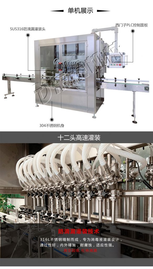 醫(yī)用酒精消毒液灌裝機(jī)主要用于洗液、護(hù)理液、口服液、消毒液、洗眼液、營養(yǎng)液、注射液、農(nóng)藥、醫(yī)藥、及特殊行業(yè)的液體灌裝。