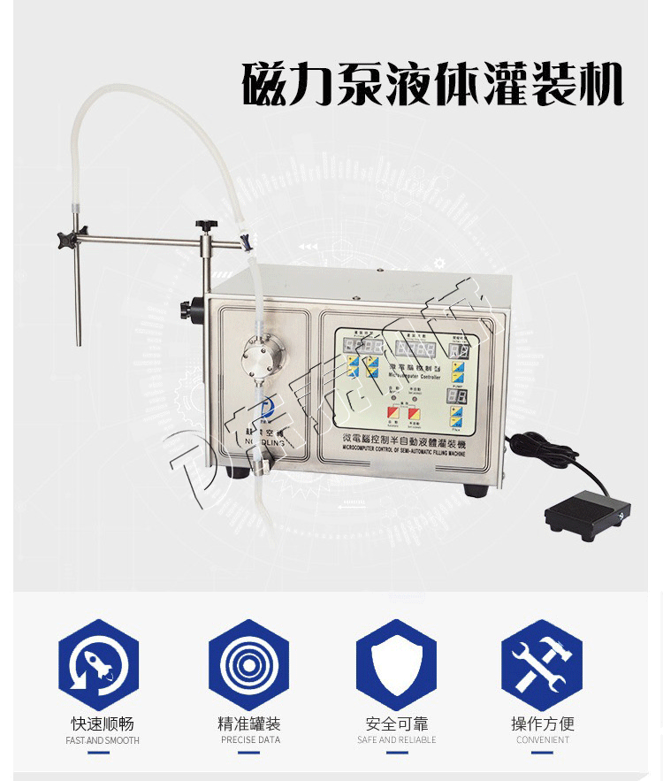 醫(yī)用小型液體灌裝機又叫小型磁力泵灌裝機可灌充絕大類型的液體,包括高粘稠度的液體。醫(yī)用小型液體灌裝機是利用位電腦對微型水泵在灌裝時間、電機轉速等因素上的控制,達到均勻的、重復誤差極小的液體灌裝方式,廣泛的應用于藥物、化工、食品、飲料、油脂、化妝品等行業(yè),適用于低粘度、無顆粒的液體分裝、小批量生產。