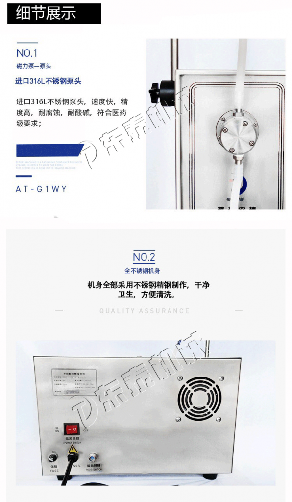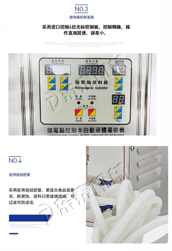 ① 本款醫(yī)用小型液體灌裝機是液體灌裝機中的一款暢銷產品,其采用變頻調速器,配進口高精度多圈電位器及可鎖表盤,使流量調節(jié)穩(wěn)定準確,誤差負偏小于0.5%,正偏小于1.5%。